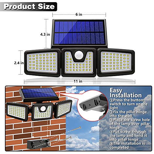 Wide Lighting Area – With the innovative wide-angle and three heads design, Adjustable heads can move upwards, downwards and horizontally. Up to 270° wide lighting angle and 16-26ft sensing distance, Easy to adjust the light heads, lens hoods and motion sensor to different angles as your requirement. Lighting direction is adjustable with the three flexible light heads, save your trouble to install two extra light. No need for electricity, environment-friendly product.